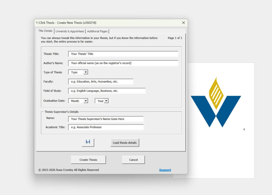Users enter the thesis title, author name, and the other information required by their institution. The template can be customised for any university. If the format does not match a particular institution’s requirements, it can be adapted accordingly. After entering the thesis details, the file can be saved and reloaded as needed.