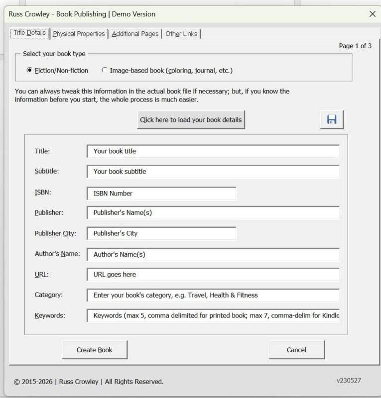 For a fiction or non-fiction book, you begin by entering the title, subtitle, and related details. You can save this information and reload it later if needed.