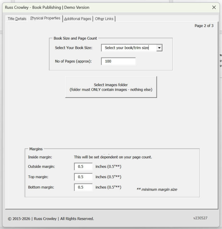 The key difference is trim size. Image-based or low-content books are usually larger because they’re intended for colouring or writing. Fiction and non-fiction books allow a full range of trim size selections. Image-based books have a reduced set of options. You also enter an approximate page count, which affects binding calculations, and specify an images folder. The application automatically inserts the images into the document, which simplifies the process.